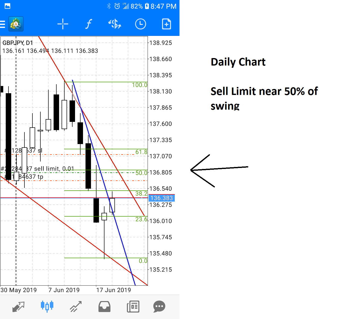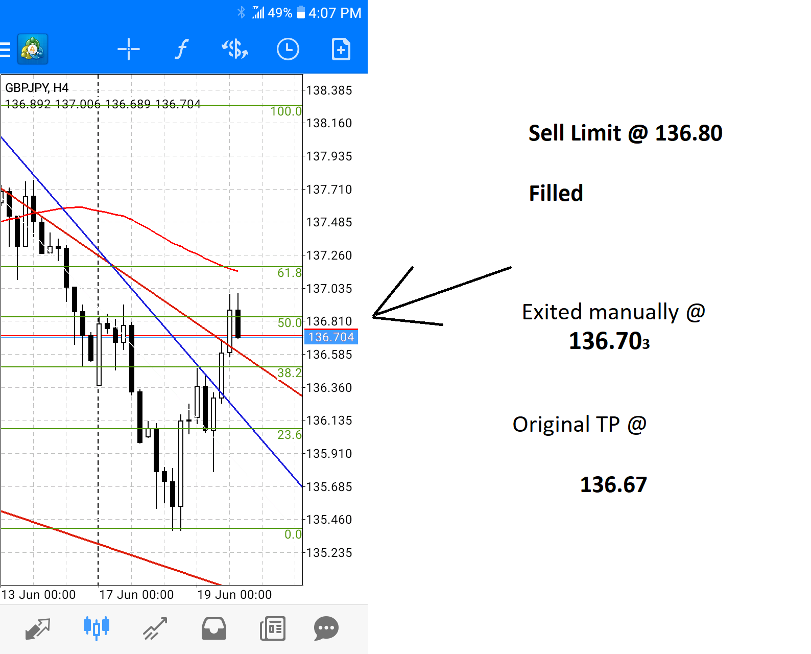 Here is another example of doing some basic drawing on the MT4 mobile app and setting up a trade. This was about 10 pips. I will scalp off of the higher time frames.