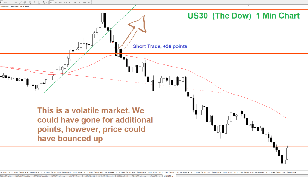 in Uncategorized U30USD (The Dow) – Short Trade Posted on 10/28/2020 by Admin 1 Minute Chart This trade was good for 36 points. The markets have been volatile. Look closely at the entry. It appears that after the (green) trendline break, there was an attempt to retest the area, then selling took over Share this:Tweet Click to email a link to a friend (Opens in new window) Email PostLike Loading... Related