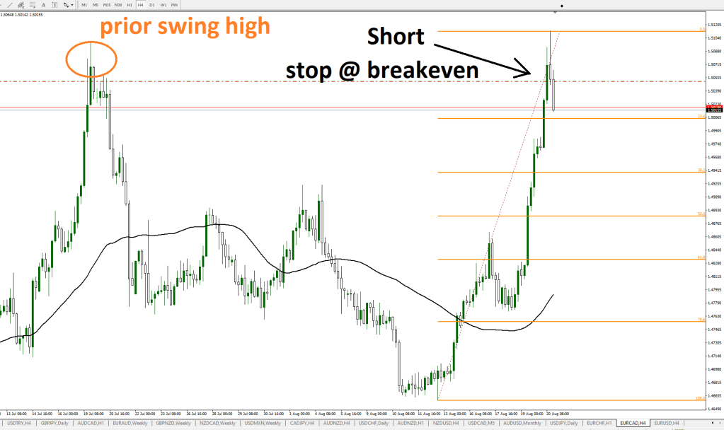 I noticed the price of this pair was at a level near a prior swing high. There was an opportunity shortly after the entry to get a stop loss order in at breakeven. That was done and now we’ll wait to see how the price action unfolds.