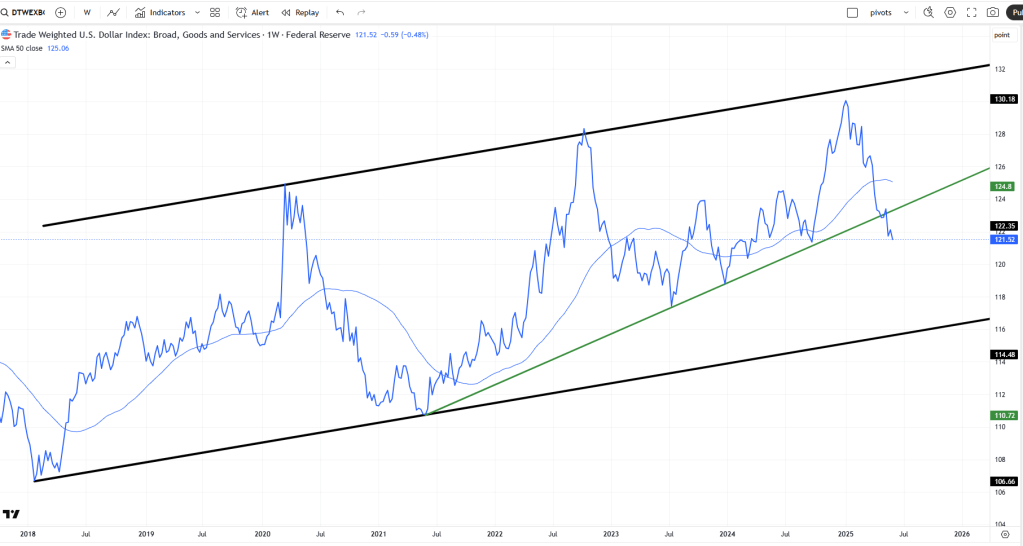 Trade Weighted U.S. Dollar Index Posted on 06/13/2025 by Admin in Index Trades Ticker DTWEXBGS gives us a different Dollar Index. The beginning of this year made a new high, taking out the high from October 2022. A few weeks have closed below the trendline. Anyway, its good to know about this index. Share this:Tweet Click to email a link to a friend (Opens in new window) Email PostLike Loading...