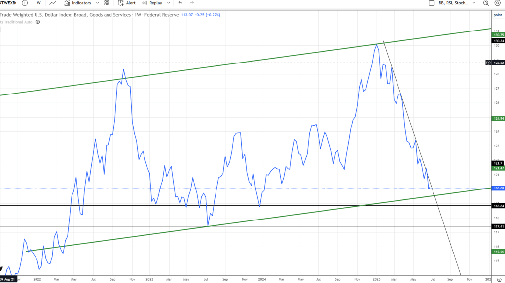 Trade Weighted U.S. Dollar Index: Broad, Goods and Services Posted on 07/01/2025 by Admin in Index Trades A brief update on this broad Dollar Index, It continued lower, but may be ready for some sort of bounce, as it comes into these levels Share this:Tweet Click to email a link to a friend (Opens in new window) Email PostLike Loading...