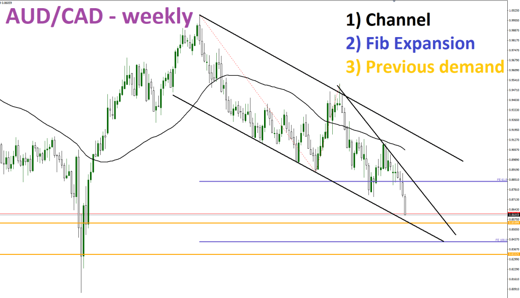 AUD/CAD – Long Term Chart Observation Posted on 10/15/2022 by Admin in Forex Trades AUD/CAD might be a good pair to keep an eye on for a potential long trade The bottom of the channel and an area where there was a very bullish weekly candle is about 60 pips below the current price. Will monitor. Share this:Tweet Click to email a link to a friend (Opens in new window) Email PostLike Loading...