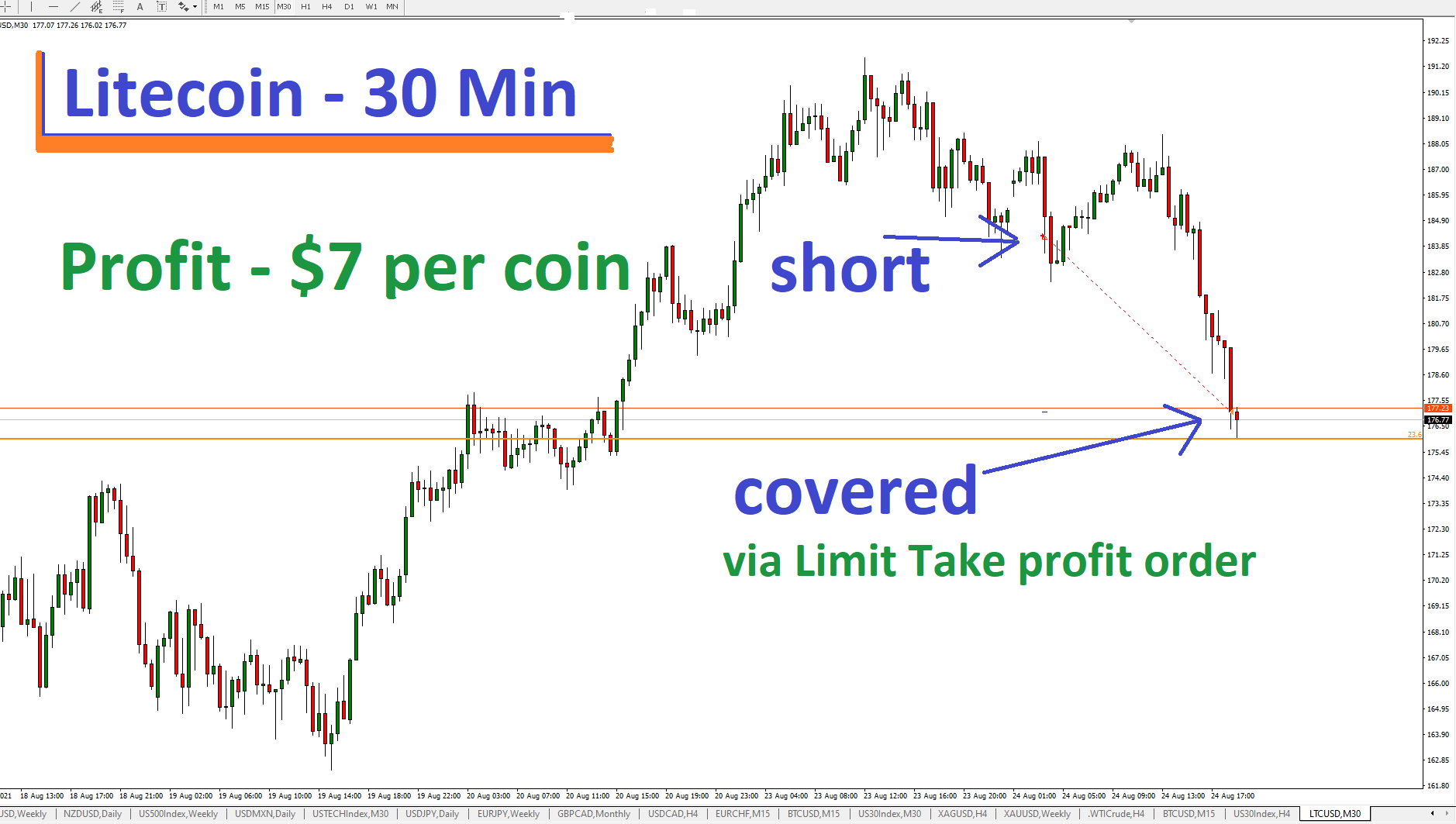 Here is a recent short trade on Litecoin, specifically LTC/USD. The first image shows the buy and sell levels and an orange line which is a Fibonacci level.